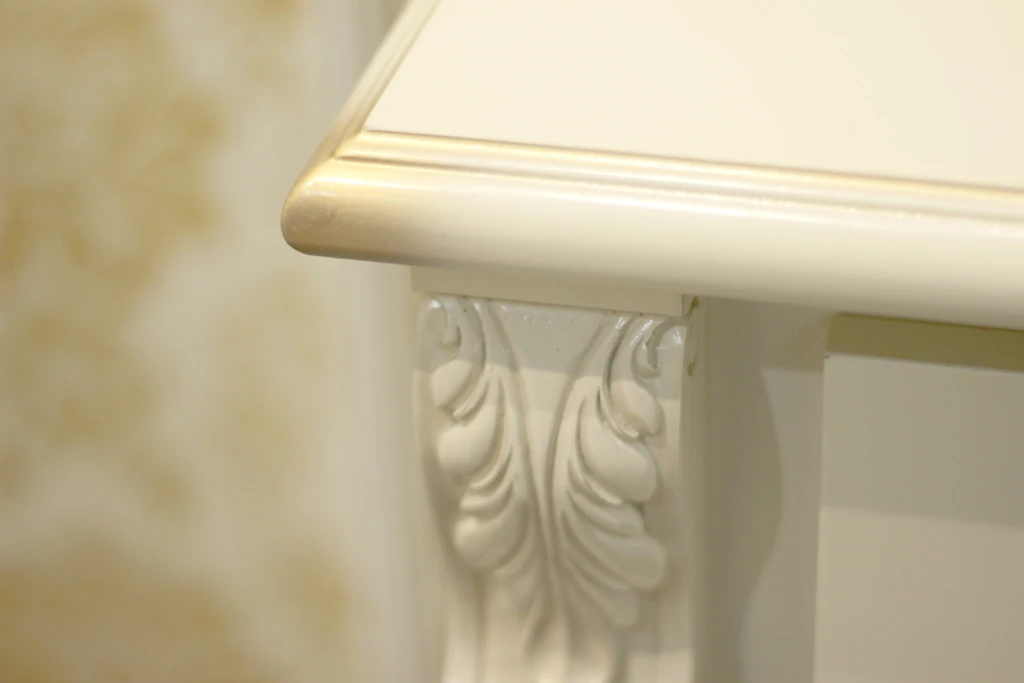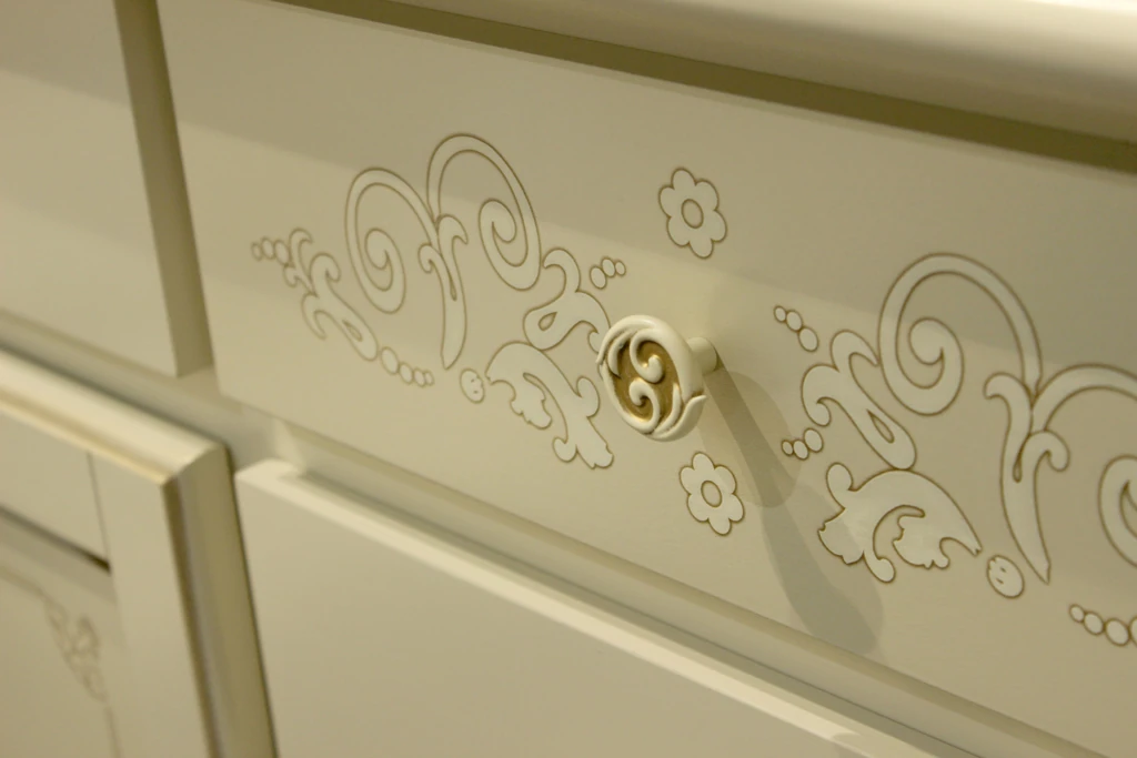Как и все предметы интерьера от молодечненских мастеров, мебель набора «Янина» снабжена высококачественной фурнитурой – это ручки-кнопки фирмы GUISTI (Италия), скрытые направляющие Tandem частичного выдвижения производства фирмы Blum (Австрия). Отделка мебели – белая эмаль и золотая патина – добавят вашей комнате деликатное сияние.